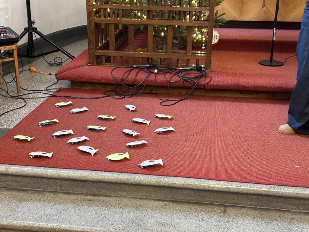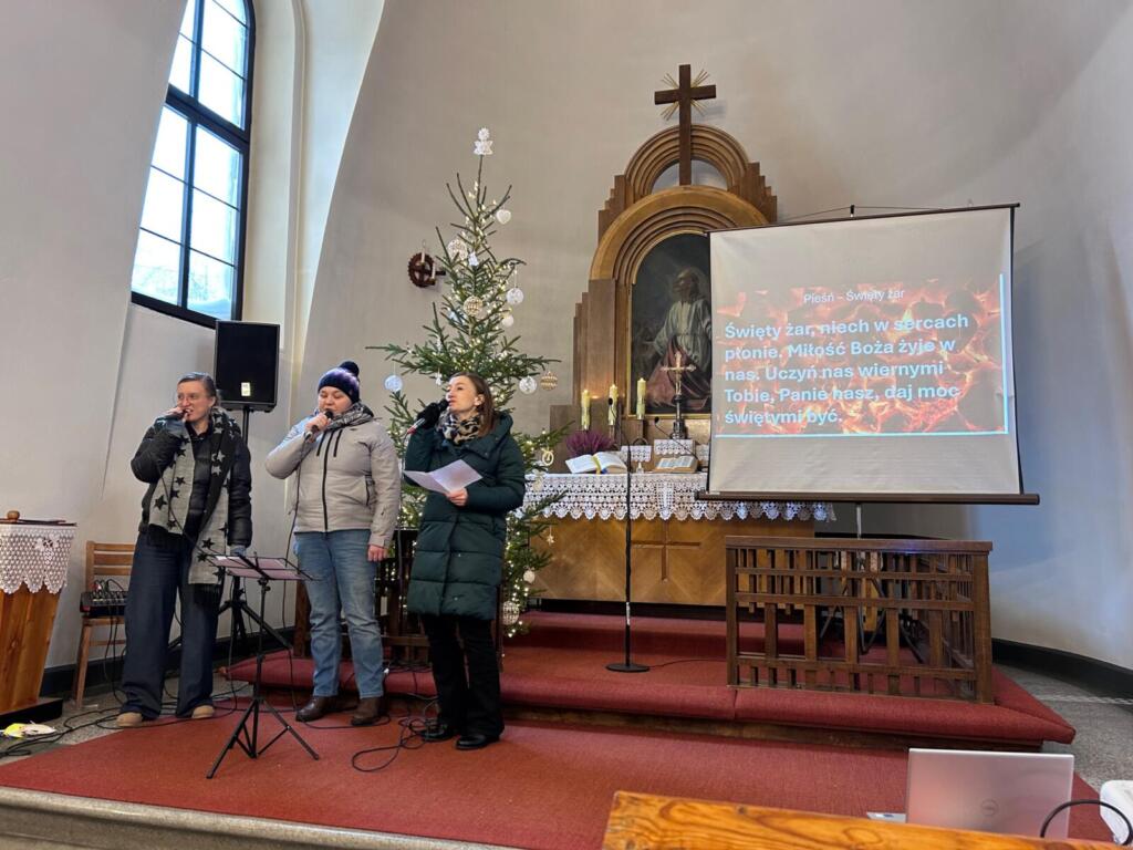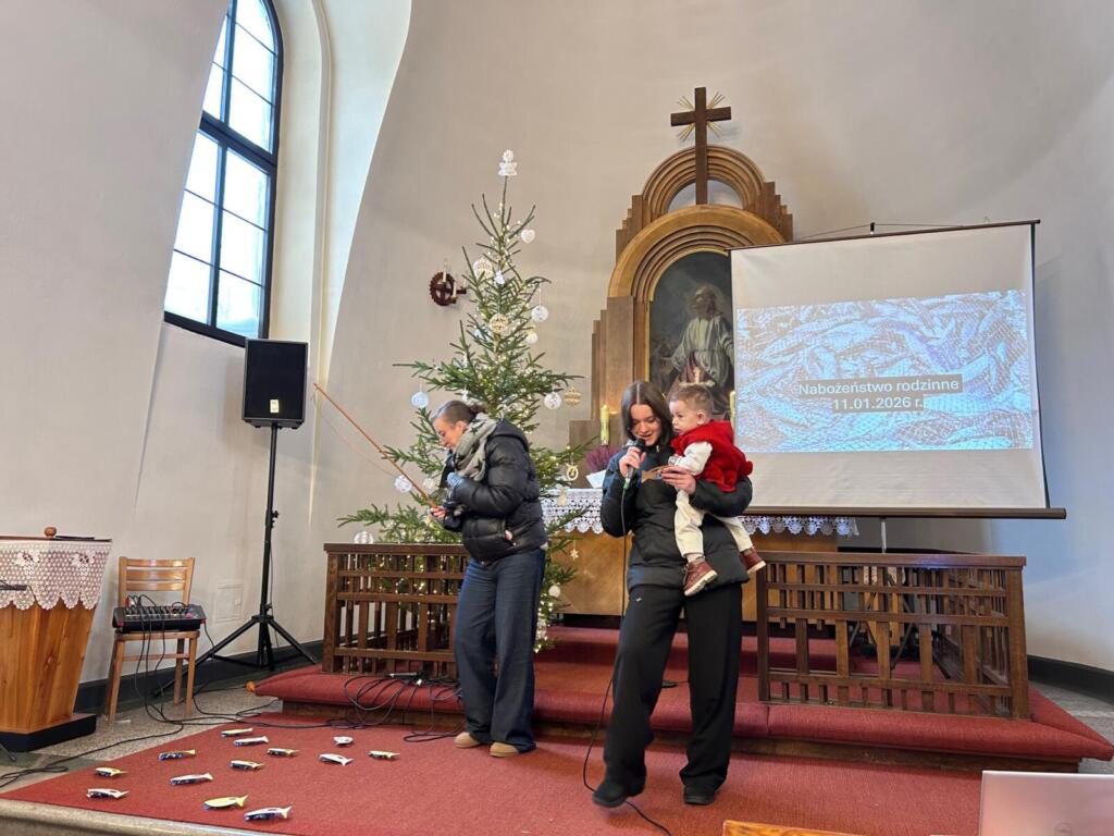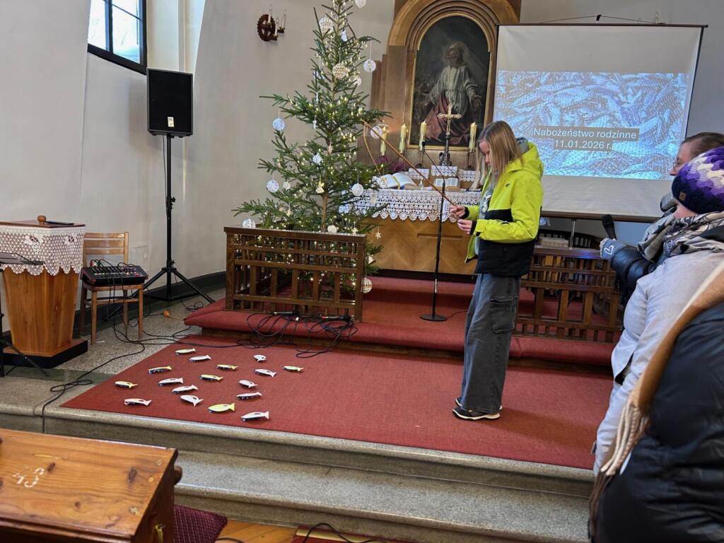 W niedzielę 11 stycznia przeżywaliśmy pierwsze tegoroczne nabożeństwo rodzinne, ale zakorzenione ono było w tematyce, którą realizujemy podczas tego typu nabożeństw w trwającym roku szkolnym. Tym razem głównym motywem była przypowieść o połowie ryb, jaką możemy znaleźć w Ewangelii Mateusza 13,47-48. W tym kontekście organizujący nabożeństwo starali się dobrać pieśni, które były wspólnie śpiewane albo klasycznie przy akompaniamencie organ, albo były prowadzone przez trio śpiewacze. Przygotowane były także rybki do łowienia, a na każdej z nich znajdował się stosowny werset oraz nagroda dla odważnych do pracy z wędką (choć w przypowieści występowała sieć, ale taki połów byłby zbyt łatwy). Trzeba dodać, że w ramach tego nabożeństwa była także okazja by podziękować Panu Bogu za pierwszy rok życia Wiktora i udzielić mu błogosławieństwa na dalszą drogę życia.